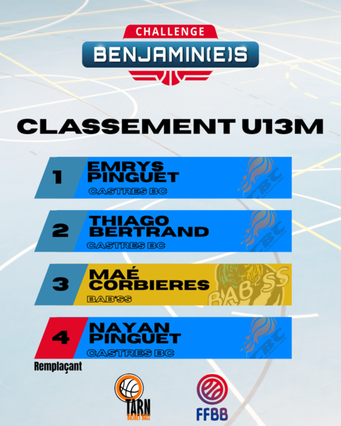 Félicitations à Nathan KEITA (CASTRES BC) qui remporte la finale régionale du Challenge Benjamins. Sa victoire lui permet de s'envoler pour la finale nationale à Paris.